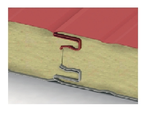 Isolation : Couche de fibres minérales haute densité (λ=0,040 W/mK) disposées perpendiculairement au plan des tôles.