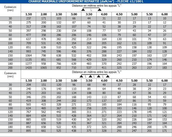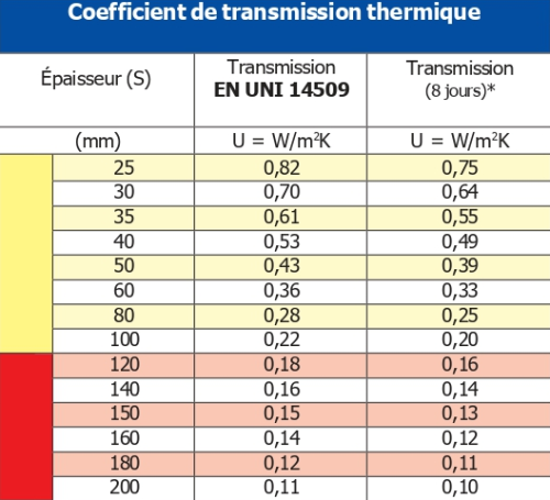 Mousses polyuréthaniques (PUR) et PIR (non standard, sur demande), densité 39 ±2 Kg/m³. Valeur déclarée du coefficient de transmission thermique d’un panneau, 25 ans après son installation.